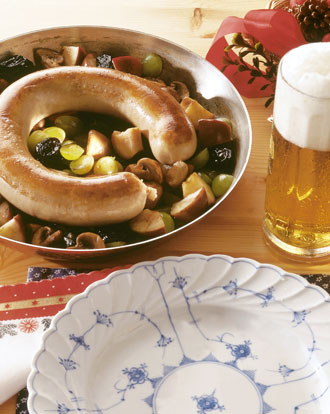 svisker, druer og sopp hass inni og rundt medisterpølsen.