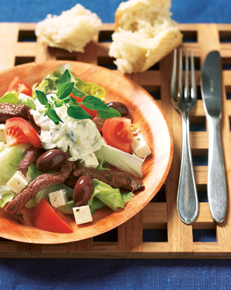 Gresk Salat med Biffstrimler 2 Under 30 min Enkelt Vis alle oppskrifter Send på SMS Avbryt Send Send på e-post * Avbryt Send Fremgangsmåte 300 g biffkjøtt i strimler ca 1 ts gresk krydderblanding 2 ss olivenolje 1 glass/boks tzatziki (ca 2 dl) 1 tomat i skiver 1/2 glass fetaost i marinade 3 salatblader 8 sorte oliven 1 baguette Slik gjør du: 1. Krydre biffkjøttet og stek det på middels varme. 2. Anrett salaten på et fat med snittet salat, tomater og fetaost. 3. Strø på biffstrimler og oliven. Serveres med brød. TZATZIKI kan du lage selv: 3 dl yoghurt naturell 1 slangeagurk ½ ts salt 3 båter finhakket hvitløk ½ ts nykvernet pepper Sil youghurten i 1 time gjennom et kaffefilter. Riv agurken på et råkostjern, tilsett salt. La det trekke i ca 10 minutter og press ut noe av vannet fra agurken. Bland så sammen youghurt, agurk, hvitløk og pepper. Ingredienser 300 g BIFFKJØTT STRIMLET Grilstad produkt i oppskriften BIFFKJØTT STRIMLET